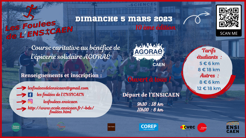 Les élèves-ingénieures et élèves-ingénieurs de l’ENSICAEN organisent dimanche 5 mars 2023 la 10e édition des « Foulées de l’ENSICAEN ». Cette course à pied, ouverte à toutes et à tous, est multi-parcours :