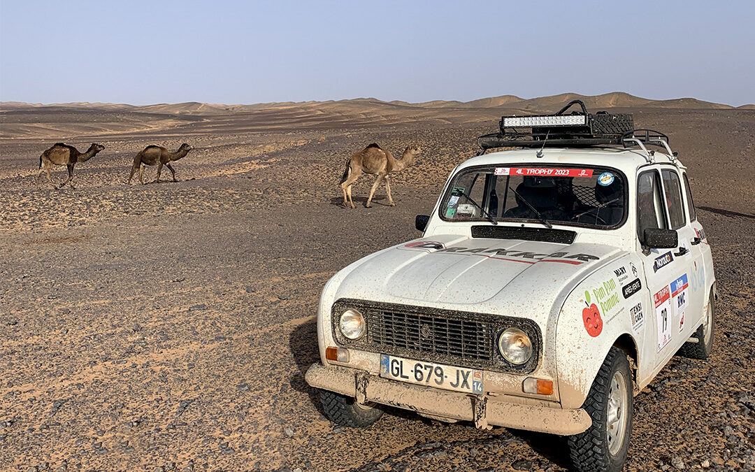 Nous avons ensuite commencé les tours de rally raid à travers différents parcours dans le désert du Sahara. A l’aide d’une feuille de route et d’une boussole, nous avons fait deux demi-journées de course d’orientation. Ces deux premières boucles ont été destructrices pour beaucoup d’équipages car le terrain est très difficile. Beaucoup se sont enlisés et pour d’autres, les cailloux, les lits de rivière desséchés et les multiples reliefs ont été fatals aux 4L.