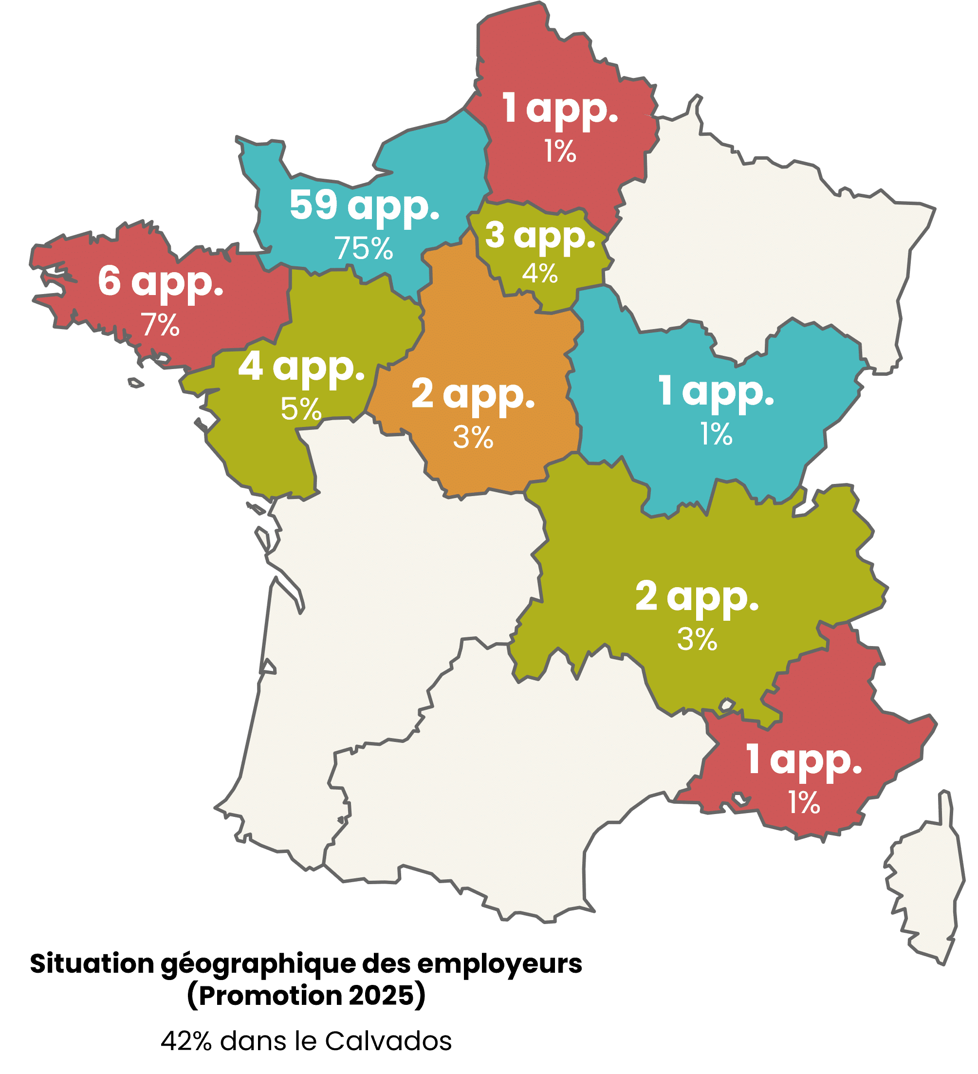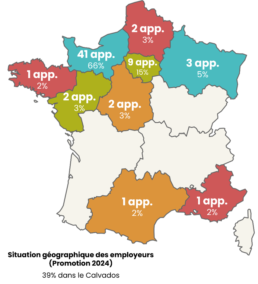 Si les élèves peuvent réaliser leur apprentissage partout en France chez un employeur fiscalement domicilié dans le pays, plus d’un tiers des élèves choisit une entreprise en Normandie. Critères de choix : entreprise proche des attaches familiales ; entreprise proche de l’ENSICAEN ; attrait pour l’entreprise et/ou les missions.