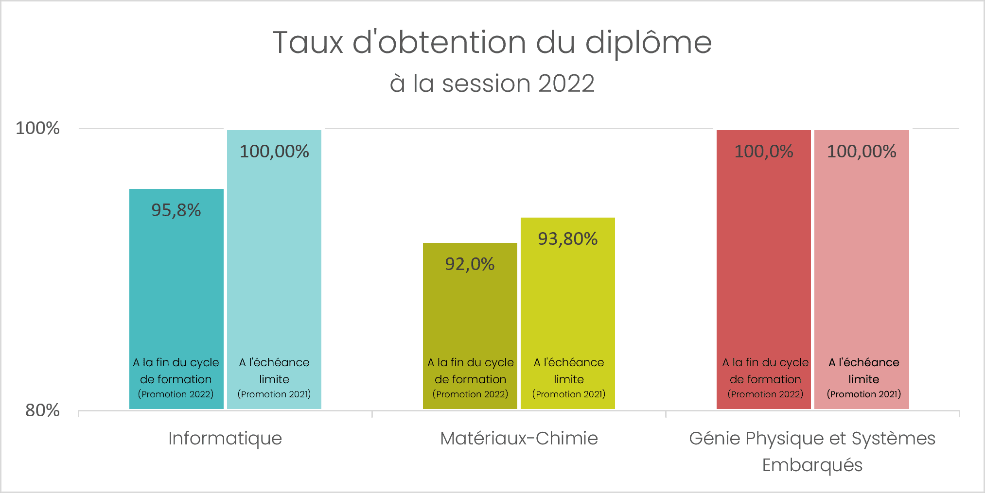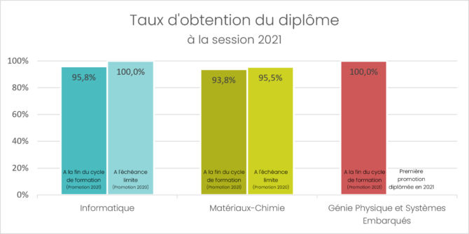 Pour chaque spécialité, le taux de la colonne de gauche correspond à l’obtention du diplôme lors de la session qui suit la fin des études (en juillet). Les échecs constatés ne sont pas définitifs, ils peuvent-être être liés :