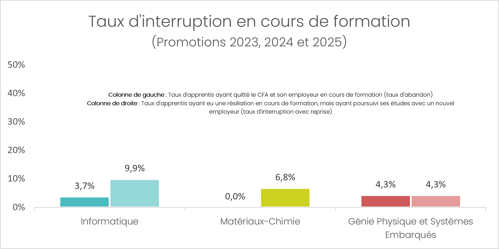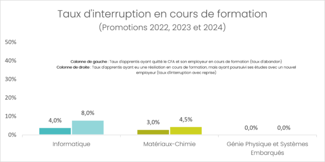 Le taux d’interruption avec reprise, correspond à des élèves dont le contrat a été interrompu. Avec l’aide du CFA, ils ont retrouvé un nouveau contrat d’apprentissage pour finir leur scolarité. Toutes ces interruptions ont été initiées par les élèves qui souhaitaient d’eux-mêmes changer d’employeur.