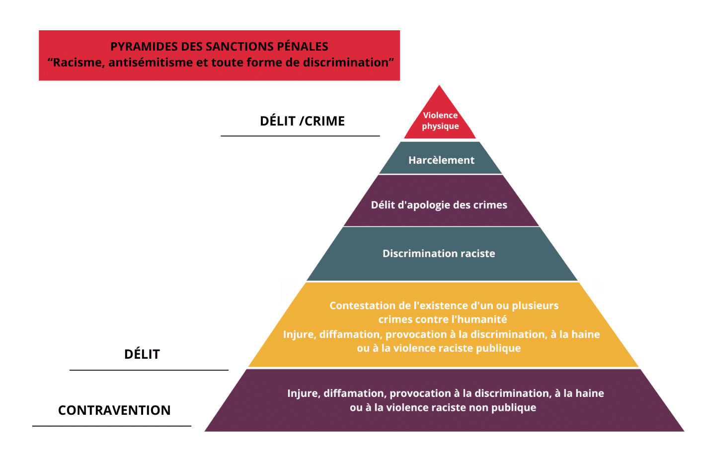 Insults, defamation or incitement to discrimination, hatred or racial violence are punishable by a fine of between 1,500 and 45,000 euros and 1 year’s imprisonment, depending on whether they are made in public. Racial discrimination is punishable by a fine of 45,000 euros and 3 years’ imprisonment, apology for crimes against humanity by a fine of 45,000 euros and 5 years’ imprisonment, and harassment by up to 75,000 euros and 5 years’ imprisonment. Physical violence is punishable by 3 years’ imprisonment and a €45,000 fine, up to life imprisonment.