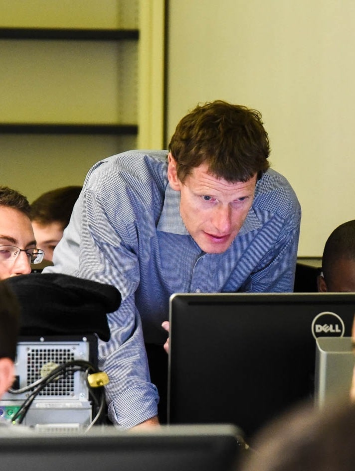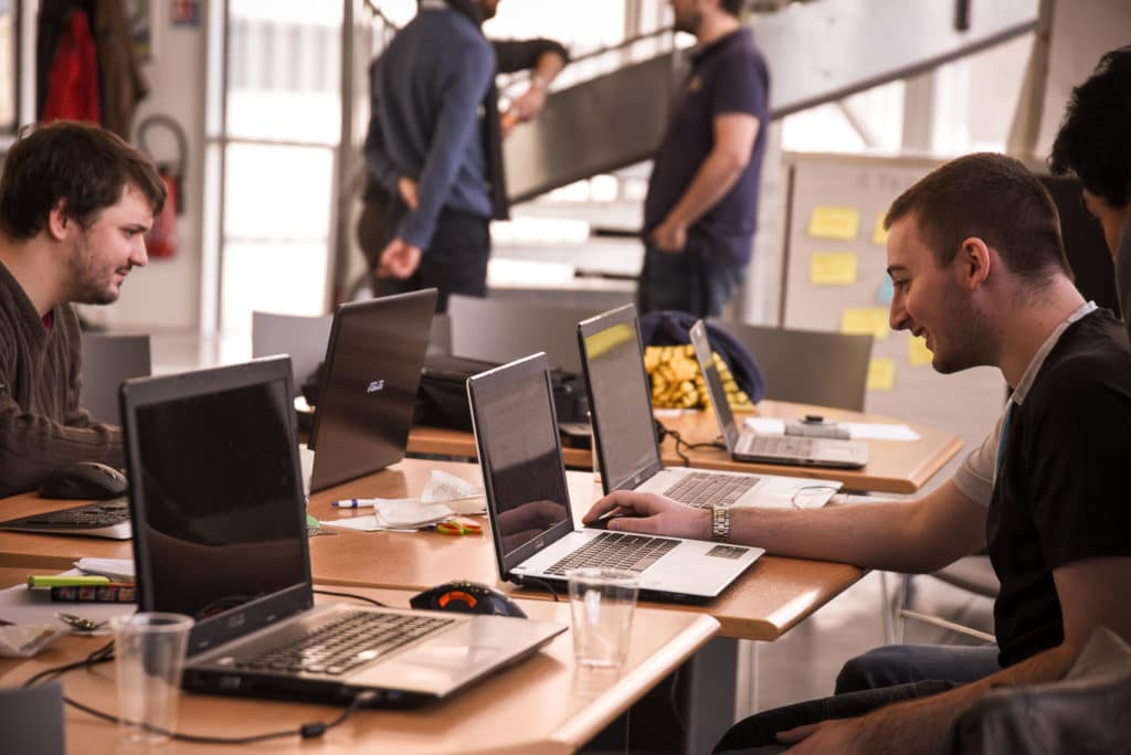 Dans un contexte de sprint, une quarantaine d’élèves réalise un challenge technologique sur fond de sérious Game. Chaque élève est libre de se positionner au sein de l’équipe afin de se projeter dans des fonctions en adéquation avec son projet professionnel.