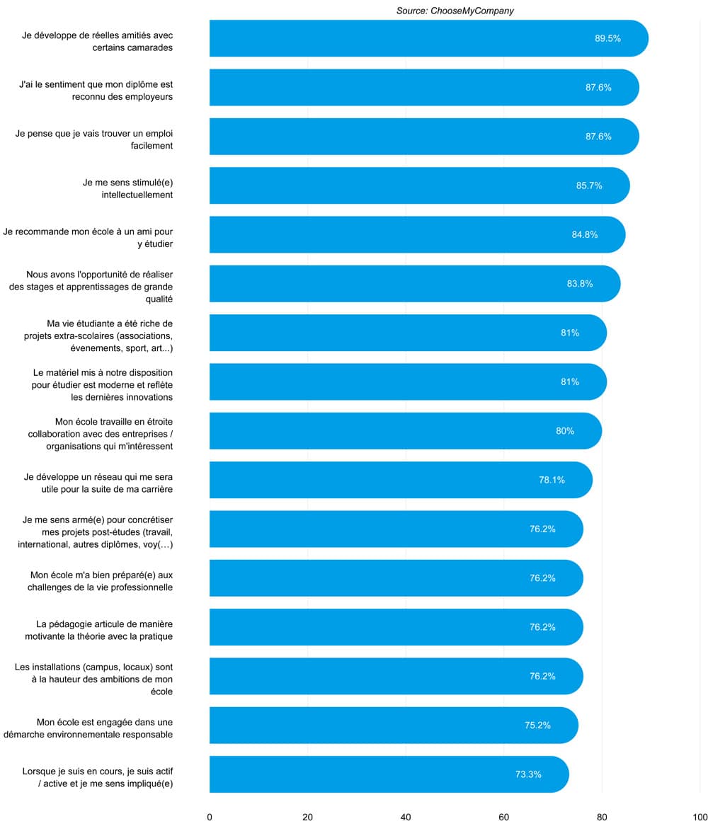 « Les étudiants savent faire la part des choses, et distinguer le long du court terme », commente Celica Thellier, co-fondatrice de ChooseMyCompany. « La qualité de la vie étudiante les déçoit tous cette année, notamment les plus âgés d’entre eux, habitués à plus d’échanges et de projets en commun. Mais ils gardent une attitude positive quant à l’avenir, et font confiance à leurs écoles pour les aider à se projeter dans le futur ».