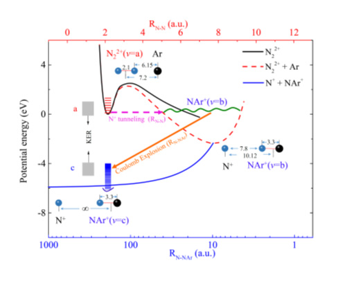 Sa présence signe l’existence surprenante de la réaction chimique, c’est-à-dire la création d’une liaison covalente, entre un fragment de la molécule d’azote et l’atome de gaz rare présent au sein du dimère initial. Ce transfert, bien connu dans le cas de la liaison hydrogène, est tout à fait surprenant dans le cas d’un ion aussi lourd que N+ et s’explique par un effet tunnel permettant à cet ion de franchir la barrière de potentiel séparant l’ion moléculaire N2+ et l’Ar et ce suffisamment rapidement pour que la liaison Ar-N+ s’établisse avant que le dimère ne se dissocie complètement sous l’effet de la répulsion coulombienne régnant entre ses constituants [5].