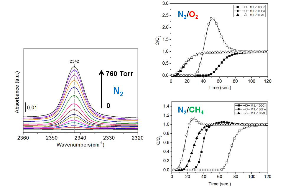 - droite : courbes de perçage des mélanges azote/oxygène (haut) et azote/méthane (bas), montrant la grande efficacité du MIL-100(Cr) par rapport à des matériaux analogues à base de fer ou d’aluminium.