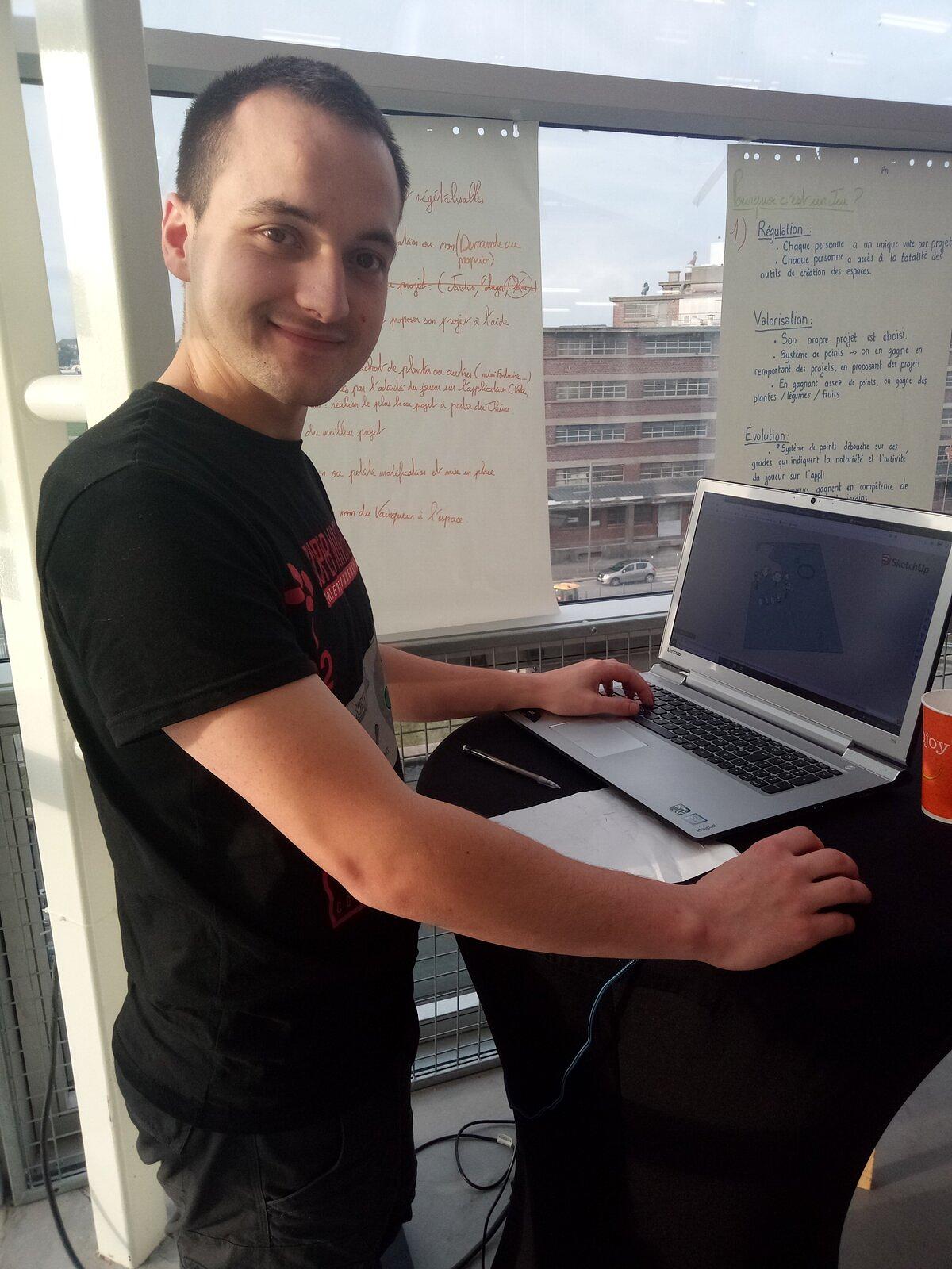 Les doigts pianotent sur les claviers, les feuilles se froissent, les voix résonnent emplissant le grand bâtiment du Dôme. Des problèmes émergent, soulevant des questions diverses : Quel slogan adopter ? Comment faire de cette idée un vrai jeu ?… ? Les avis fusent, souvent divergents. Néanmoins, une cohésion se crée, chacun trouve sa propre place et s’affaire à ses propres tâches comme Bertrand, élève-ingénieur à l’ENSICAEN : “J’étais en charge avec Esther de la création 3D de la maquette. Le FabLab était comme un deuxième bureau !”